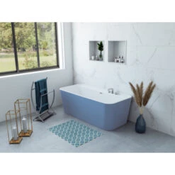 Dit Allibert Bad Kolora Vrijstaand Blauw Mat 170×78 cm is een echte blikvanger in jouw badkamer. Dit duoligbad is vervaardigd uit sterk acryl. De buitenafmetingen zijn 170 cm lang, 78 cm breed en 58,4 cm hoog. De afvoer en de regelbare metalen poten worden meegeleverd. De afvoer zit in het midden van het bad zodat je perfect met twee van dit ligbad kan genieten. De afgeschuinde rugwanden zorgen extra ligcomfort. In het middelpunt van de huidige badkamers biedt dit vrijstaande bad een onmiskenbaar moderne uitstraling! Met zijn trendy afwerkingen brengt het Kolora duoligbad stijl en comfort. Je kan dit ligbad zowel vrijstaand plaatsen als tegen de muur. Dankzij het in de badkuip geïntegreerde tablet zijn jouw verzorgingsproducten binnen handbereik.