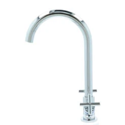 De Aqualino Ceronda springt in het oog door verschillende eigenschappen. Zo heeft deze keukenkraan een stijlvolle gebolde uitloop en 2 karakteristieke kruisgrepen. Het is een mengkraan die beschikt over keramische schijven die de beniening van de knoppen versoepelen. De gebogen uitloop is draaibaar en heeft een siliconen anti kalk straalregelaar. Die zorgt voor een constante bruisende waterstraal. Naast het decoratieve voordeel van deze hoge uitloop is het ook nog eens vrij praktisch. Grote pannen en emmers zijn minder snel te groot om in de gootsteen te kunnen vullen. Bij laag hangende keukenkastjes moet je wel even opletten dat de kraan er onder past.