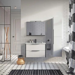 De Atlantic badmeubelset Aria met spiegel en witte wastafel 80cm Mat Wit is een hangende set met een industriele uitstraling. Dankzij het hangende design creëer je een ruimtelijke look in jouw badkamer. Het meubel is voorzien van 2 soft close laden en een mat witte keramische wastafel. Ook zijn er zwarte profielen geplaatst op de randen van het badmeubel voor een extra stoere look. Daarnaast is aan deze set een losse vierkante spiegel met planchet toegevoegd. De set is voorzien van stijlvolle mat zwarte grepen, wat zorgt voor een chique en industrieel uiterlijk. De set wordt flatpacked geleverd en is eenvoudig te installeren met de meegeleverde bevestigingsmaterialen. Exclusief wastafelkraan.