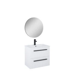 De Atlantic badmeubelset Stella met spiegel en witte wastafel 60cm Mat Wit is een hangende set met een chique uitstraling. Dankzij het hangende design creëer je een ruimtelijke look in jouw badkamer. Het meubel is voorzien van 2 soft close laden en een mat zwarte keramische wastafel. Daarnaast is aan deze set een losse ronde spiegel toegevoegd. De set is voorzien van stijlvolle mat zwarte grepen, wat zorgt voor een chique en industrieel uiterlijk. De set wordt flatpacked geleverd en is eenvoudig te installeren met de meegeleverde bevestigingsmaterialen. Exclusief wastafelkraan.