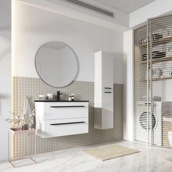 De Atlantic badmeubelset Stella met spiegel en zwarte wastafel 60cm Mat Wit is een hangende set met een chique uitstraling. Dankzij het hangende design creëer je een ruimtelijke look in jouw badkamer. Het meubel is voorzien van 2 soft close laden en een mat zwarte keramische wastafel. Daarnaast is aan deze set een losse ronde spiegel toegevoegd. De set is voorzien van stijlvolle mat zwarte grepen, wat zorgt voor een chique en industrieel uiterlijk. De set wordt flatpacked geleverd en is eenvoudig te installeren met de meegeleverde bevestigingsmaterialen. Exclusief wastafelkraan.