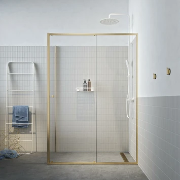Van basic naar luxe badkamer. Deze schuifdeur met zijwand uit de Contour-serie heeft een solide bouw en toch een minimalistische, chique uitstraling. De geborstelde gouden kleurafwerking van het profiel roept direct een sfeervol, luxe gevoel op. Het heldere veiligheidsglas van de deur en de zijwand is 6 mm dik en voorzien van een antikalklaag. Hierdoor blijft je douchewand langer mooi. Doordat de deur schuift, past deze ruime oplossing ook in kleinere badkamers. Een gouden combinatie dus!