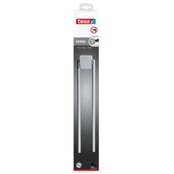 Met de tesa® Ekkro hoogglans verchroomde twee-armige handdoekhouder hang je compact en efficiënt twee handdoeken op. Monteren is heel eenvoudig met de gepatenteerde tesa® Power.Kit technologie: 1) Plak de adapters op de muur en vul deze met de tesa® Power.Kit-lijm 2) Laat vervolgens de lijm 12 uur uitharden 3) Schroef de handdoekhouder vast op de adapter. Alle benodigde materialen zijn in de verpakking bijgesloten: handdoekhouder en bevestigingset BK20 .Je kunt de houder later ook weer snel verwijderen, zonder lijmresten. Met de eveneens los verkrijgbare adapter BK20 is het dan geen probleem om de handdoekhouder weer ergens anders te bevestigen. Geschikt voor tegels, metaal, natuursteen, marmer, beton, hout, glas en vele soorten kunststof. Niet geschikt voor behang, stucwerk en andere oppervlakken met een antikleeflaag. Er zijn van deze Ekkro serie diverse sanitair accessoires verkrijgbaar, voor een complete look. Geef je badkamer een nieuwe stijl met Ekkro.