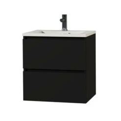 Het greeploze Tiger badkamermeubel Karlo is speciaal ontworpen voor de moderne en industriële badkamer. De volledig voorgemonteerde wastafelonderkast van 60 cm in mat zwart heeft twee ruime lades om al je verzorgingsproducten overzichtelijk in op te bergen. De metalen lades zijn uitgerust met hoogwaardige softclose geleiders waardoor ze altijd geruisloos sluiten. De bovenste lade heeft een mooi afgewerkte sifon uitsparing. Daarnaast bestaat deze set uit een glanzend witte polybeton wastafel. Tijdens het ontwerpproces van de waskom is goed nagedacht over een juiste balans tussen design en functionaliteit. Polybeton wastafels zijn hygiënisch en gemakkelijk in onderhoud. De wastafel heeft een externe overloop en 1 kraangat. Voor het overloopgat wordt een sierring in zowel chroom als zwart meegeleverd waardoor deze altijd mooi aansluit bij je badkameraccessoires.