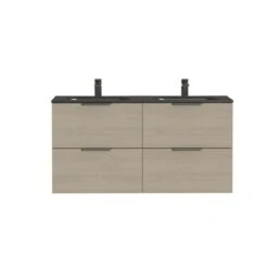 Door het strakke en tijdloze design past dit Tiger Studio badkamermeubel in iedere badkamer. Deze wastafelonderkast heeft 2 ruime lades om alle badkamerspullen overzichtelijk in op te bergen. De lades zijn uitgerust met hoogwaardige ‘soft close’ geleiders waardoor ze geruisloos sluiten. De warme houttint geeft een sfeervol karakter aan het meubel. Daarnaast krijgt het meubel, door de voelbare houtnerf, een mooie natuurlijke uitstraling. De mooie, zwart matte polybeton wastafel met ovale waskommen en rvs grepen maken deze set compleet.