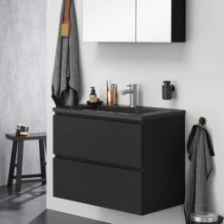 Het greeploze Tiger Karlo badkamermeubel is speciaal ontworpen voor de moderne en industriële badkamer. De volledig voorgemonteerde wastafelonderkast van 80 cm in mat zwart heeft twee ruime lades om al je verzorgingsproducten overzichtelijk in op te bergen. De metalen lades zijn uitgerust met hoogwaardige softclose geleiders waardoor ze altijd geruisloos sluiten. De bovenste lade heeft een mooi afgewerkte sifon uitsparing.