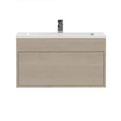 Het Tiger Helsinki badkamermeubel is een simplistisch, modern en greeploos meubel in Scandinavisch design. De wastafelonderkast is voorzien ruime lades waarin alle badkamerspullen overzichtelijk opgeborgen kunnen worden. Voor extra comfort is deze onderkast voorzien van handige ‘push to open’ lades waardoor ze al middels één simpele aanraking openen. De warme houttint geeft een sfeervol karakter aan het meubel. Daarnaast krijgt het meubel, door de voelbare houtnerf, een mooie natuurlijke uitstraling .De strak vomgegeven polybeton wastafel maakt deze set compleet.