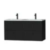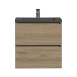 Het greeploze Tiger Karlo badkamermeubel is speciaal ontworpen voor de strakke en moderne badkamer. De wastafelonderkast heeft 2 ruime lades om alle badkamerspullen overzichtelijk in op te bergen. De lades zijn uitgerust met hoogwaardige ‘soft close’ geleiders waardoor ze geruisloos sluiten. De warme houttint geeft een sfeervol karakter aan het meubel. Daarnaast krijgt het meubel, door de voelbare houtnerf, een mooie natuurlijke uitstraling. De strakke, mat zwarte polybeton wastafel met immitatie natuursteen look maakt deze set compleet.