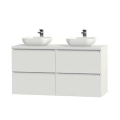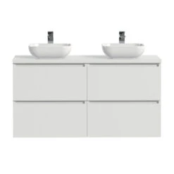 Het greeploze Tiger Karlo badkamermeubel is speciaal ontworpen voor de strakke en moderne badkamer. De wastafelonderkast heeft 2 ruime lades om alle badkamerspullen overzichtelijk in op te bergen. De lades zijn uitgerust met hoogwaardige ‘soft close’ geleiders waardoor ze geruisloos sluiten. Door de mooie heldere witte kleur krijgt het meubel een tijdloze uitstraling. Het wit houten wasblad is reeds voorzien van een uitsparing voor kraan en waskom. De elegante, onderhoudsarme keramische waskom maakt de set compleet.
