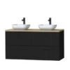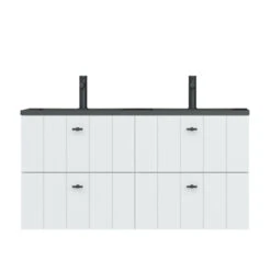 Landelijk design in een modern jasje. De Tiger Maryport wastafelonderkast van 120 cm in mat wit zorgt voor een luxe, sfeervolle look en houdt badkamer en geest opgeruimd. Deze volledig voorgemonteerde wastafelonderkast heeft 4 ruime lades met softclose geleiders om al je verzorgingsproducten overzichtelijk in op te bergen. De half voorgeboorde gaten voor de matzwarte grepen zorgen voor een eenvoudige montage. De look wordt compleet dankzij de matzwarte polybeton wastafel met natuursteen uitstraling.