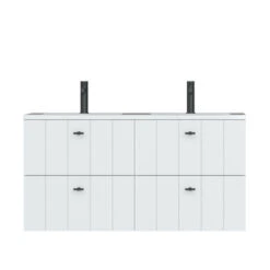Landelijk design in een modern jasje. De Tiger Maryport wastafelonderkast van 120 cm in mat wit zorgt voor een luxe, sfeervolle look en houdt badkamer en geest opgeruimd. Deze volledig voorgemonteerde wastafelonderkast heeft 4 ruime lades met softclose geleiders om al je verzorgingsproducten overzichtelijk in op te bergen. De half voorgeboorde gaten voor de matzwarte grepen zorgen voor een eenvoudige montage. De look wordt compleet dankzij de wit glanzende polybeton wastafel. Deze wastafel is hygiënisch en gemakkelijk in onderhoud.