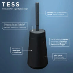 Een fris en modern gevoel in toilet of badkamer dankzij deze zwarte wc-borstelhouder van Tiger Tess. Hang hem aan de muur of zet hem neer. Plak of monteer hem met schroeven en pluggen. Het is helemaal aan jou. Deze houder is voorzien van de nieuwe Swoop® flexibele toiletborstel. Met deze innovatieve borstelkop reinig je met gemak moeilijk bereikbare plekken en dankzij de vorm en het speciale materiaal van de borstel blijft er geen viezigheid achter en druppelt hij nauwelijks na als je hem terug in de houder plaatst. Tiger Tess is innovatief en eigentijds met de herkenbare kwaliteit van Tiger.